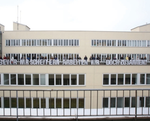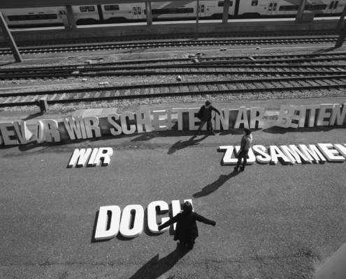 Die Jugendlichen erarbeiteten in den Workshops das Handwerk, Pop-up Buchstaben aus Karton zu bauen und diese in einer Inszenierung handzuhaben. Expertinnen waren zu Beginn in den Workshops zur handwerklichen Unterstützung federführend dabei. Die TeilnehmerInnen erlebten auch die Bedeutsamkeit von Sprache, den Umgang mit Sprache, die Wichtigkeit des geschriebenen Worts und der Umsetzung von Inhalten. Die gemeinsame Inszenierung der Buchstaben im öffentlichen Raum war für die Jugendlichen eine Herausforderung, da sie Orte wählten, mit denen sie eine persönliche Verbindung hatten und an denen sie die Botschaft sehen wollten, nämlich ihre Ausbildungsplätze und Orte, an denen sie sich aufhielten. Gleichzeitig wurden auch sie selbst öffentlich sichtbar, mussten sich mit der Handhabung der Buchstaben auseinandersetzen und wurden Teil der kontinuierlichen Foto- und Videodokumentation, die wiederum in Ausstellungen gezeigt wurde. Die Botschaft des Projekts spricht viele unterschiedliche Personen und Organisationen an. Nach den geplanten Inszenierungen an den gewählten Orten der Jugendlichen und an den gewählten Orten des KunstRaum Goethestrasse xtd, wurden die Botschaften Organisationen angeboten und die Buchstaben auf Anfragef ür Veranstaltungen und Orte verliehen. Somit stehen die Buchstaben jenen zur Verfügung, die die Botschaft mittragen, weitergeben und unterstützen wollen. Bevor wir scheitern arbeiten wir doch zusammen geht auch Jahre später noch weiter auf Reisen.